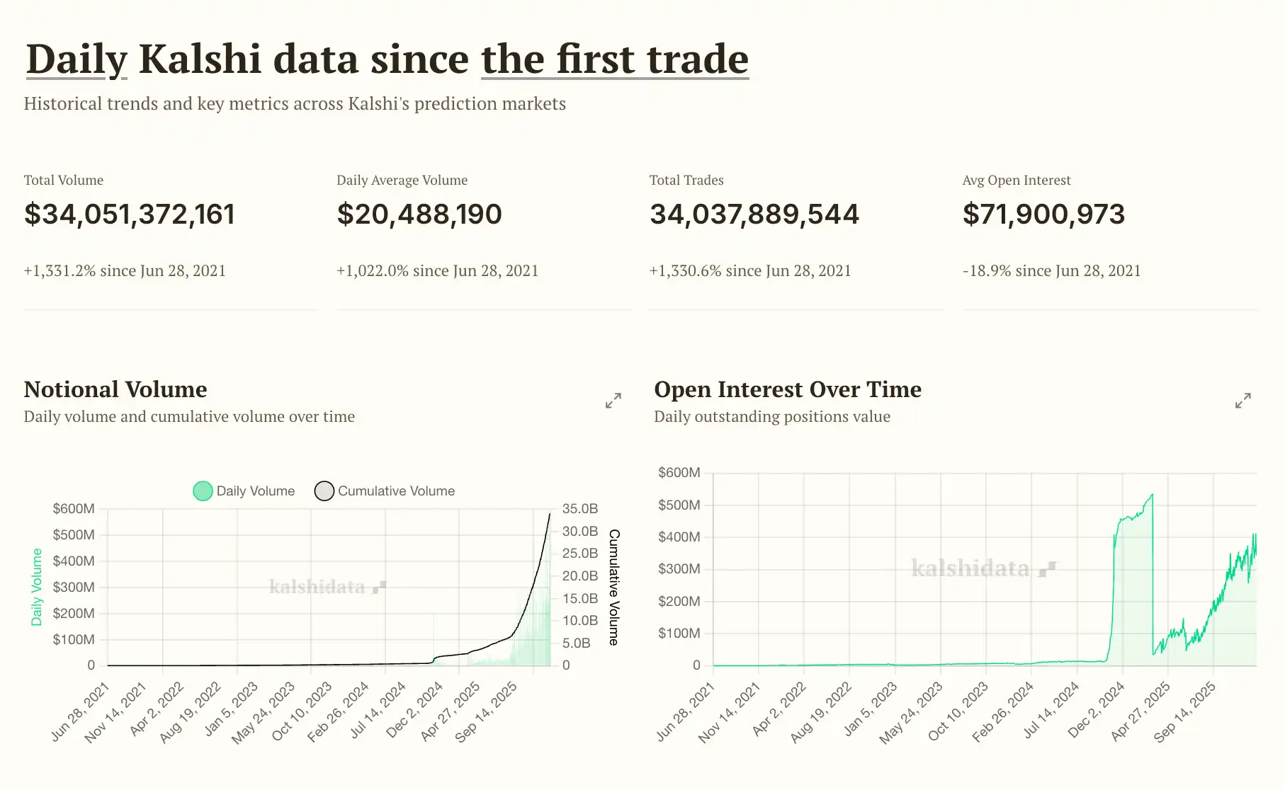 26 जनवरी को, कल्शी डेटा ने ट्वीट किया कि 23 जनवरी तक कल्शी का मासिक नॉमिनल ट्रेडिंग वॉल्यूम लगभग 6.7 अरब डॉलर है, और औसतन दैनिक वॉल्यूम लगभग 293 मिलियन डॉलर है। यदि वर्तमान गति बनी रहे तो कल्शी का जनवरी का नॉमिनल ट्रेडिंग वॉल्यूम लगभग 9.1 अरब डॉलर होने की उम्मीद है।