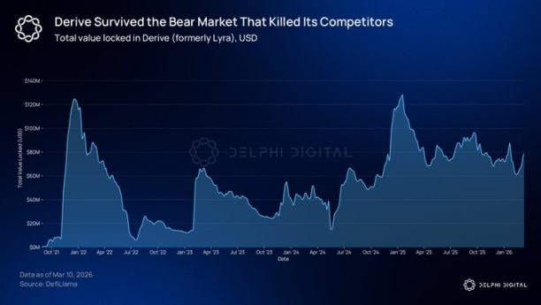 @DeriveXYZ अभी भी शीर्ष ऑन-चेन ऑप्शन प्रोटोकॉल है, जिसने पिछले 30 दिनों में 7 अरब डॉलर से अधिक का नामित ऑप्शन व्यापार किया है। यह प्रोटोकॉल 2021 अगस्त में Lyra के नाम से ऑप्शन ऑटोमेटेड मार्केट मेकर (AMM) के रूप में लॉन्च किया गया था, और बाद में 2023 में पूरी तरह से पुनर्निर्मित किया गया, जिसके बाद अब इसका स्वयं का OP Stack Layer 2 के आधार पर बिना ईंधन शुल्क का सेंट्रल लिमिट ऑर्डर बुक बनाया गया है।