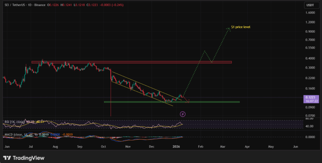 वर्तमान में, SEI $0.12 के पास व्यापार कर रहा है, जो दिसंबर के अंत से पुलबैक को सीमित करने वाले क्षैतिज स्तर पर समर्थन बनाए रख रहा है। स्थिरता के बावजूद, व्यापक प्रवृत्ति अभी भी बेयरिश बनी हुई है, क्योंकि SEI गर्मियों के उच्चतम स्तर से 60% से अधिक की कमी का अनुभव कर चुका है। मूल्य गति एक उत्थान के लिए बहुत कम गति दिखा रहा है, संकेतकों का सुझाव है कि बाजार अभी भी एक संयोजन चरण में है। हालांकि, जब तक SEI $0.11 के ऊपर बना रहता है, तब तक आगे की गिरावट का जोखिम कम हो जाता है।