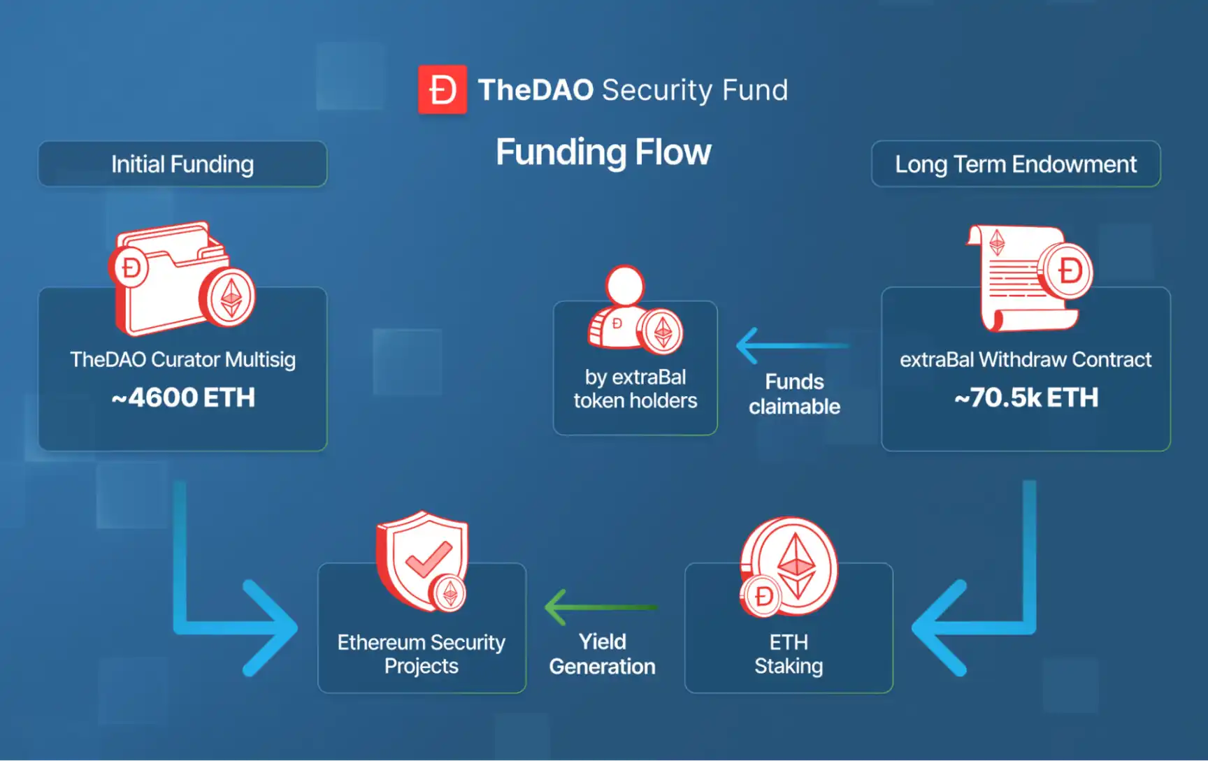 अधिकारियों के बयान के अनुसार, TheDAO सुरक्षा कोष के धन के मुख्य रूप से दो स्रोत हैं, जो कुल मिलाकर 75,109 ETH (22 करोड़ डॉलर के बराबर) से अधिक हैं: