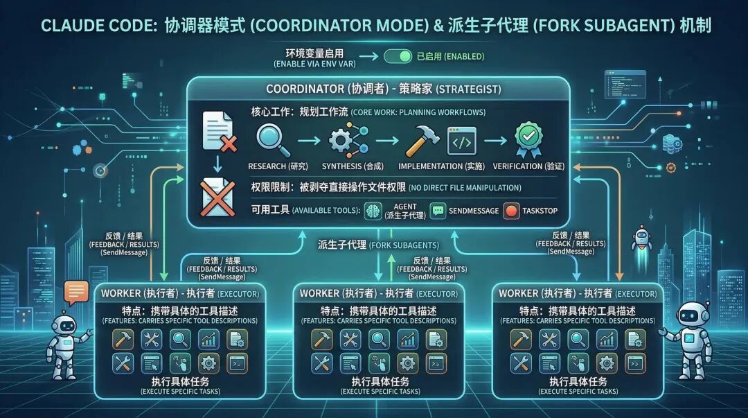 - Coordinator (Koordinator): Kehilangan izin untuk mengoperasikan file secara langsung, hanya mempertahankan tiga alat: Agent (agen turunan), SendMessage, dan TaskStop. Satu-satunya tugasnya adalah merencanakan alur kerja (Penelitian → Sintesis → Implementasi → Verifikasi).