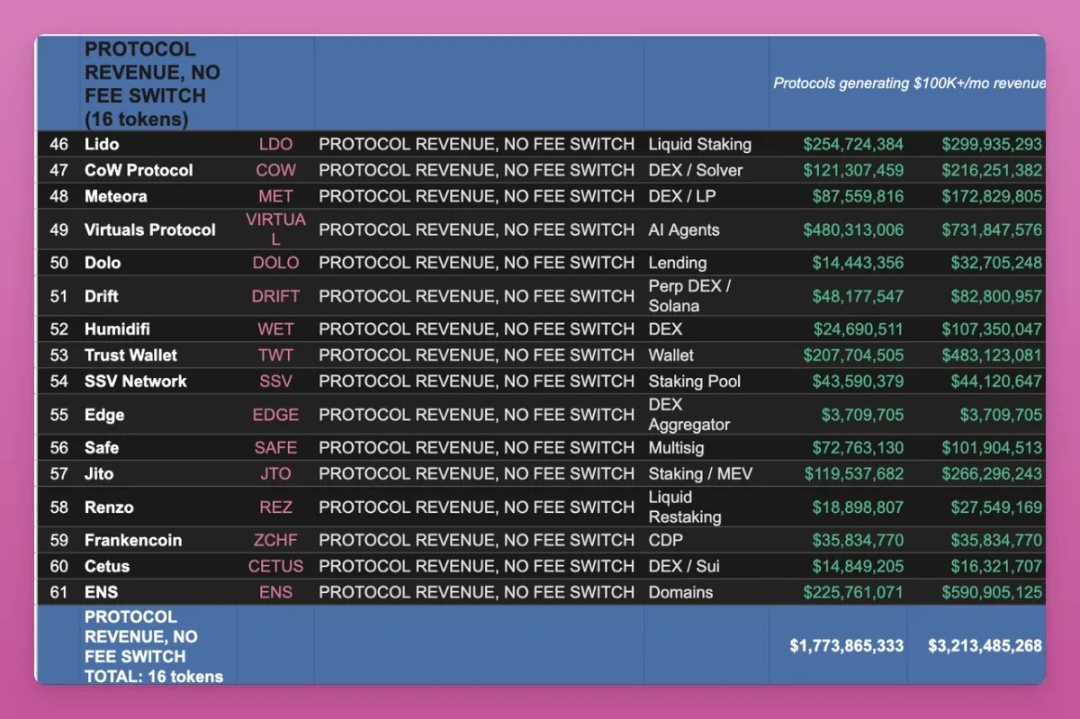 このタイプのトークンは合計16個で、月間プロトコル収入は10万ドル以上であり、収益は財庫に留まります。