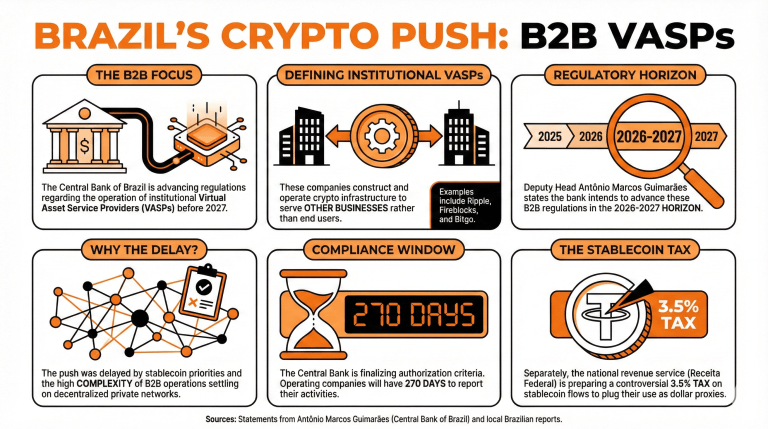 中央銀行は、インフラを運営し、他の機関にcryptoサービスを提供する組織として定義されるいわゆる機関向けVASPの規制枠組みの設計に注力する。この動きは、Fireblock、Ripple、Bitgoのような企業にブラジル市場における明確性をもたらすだろう。