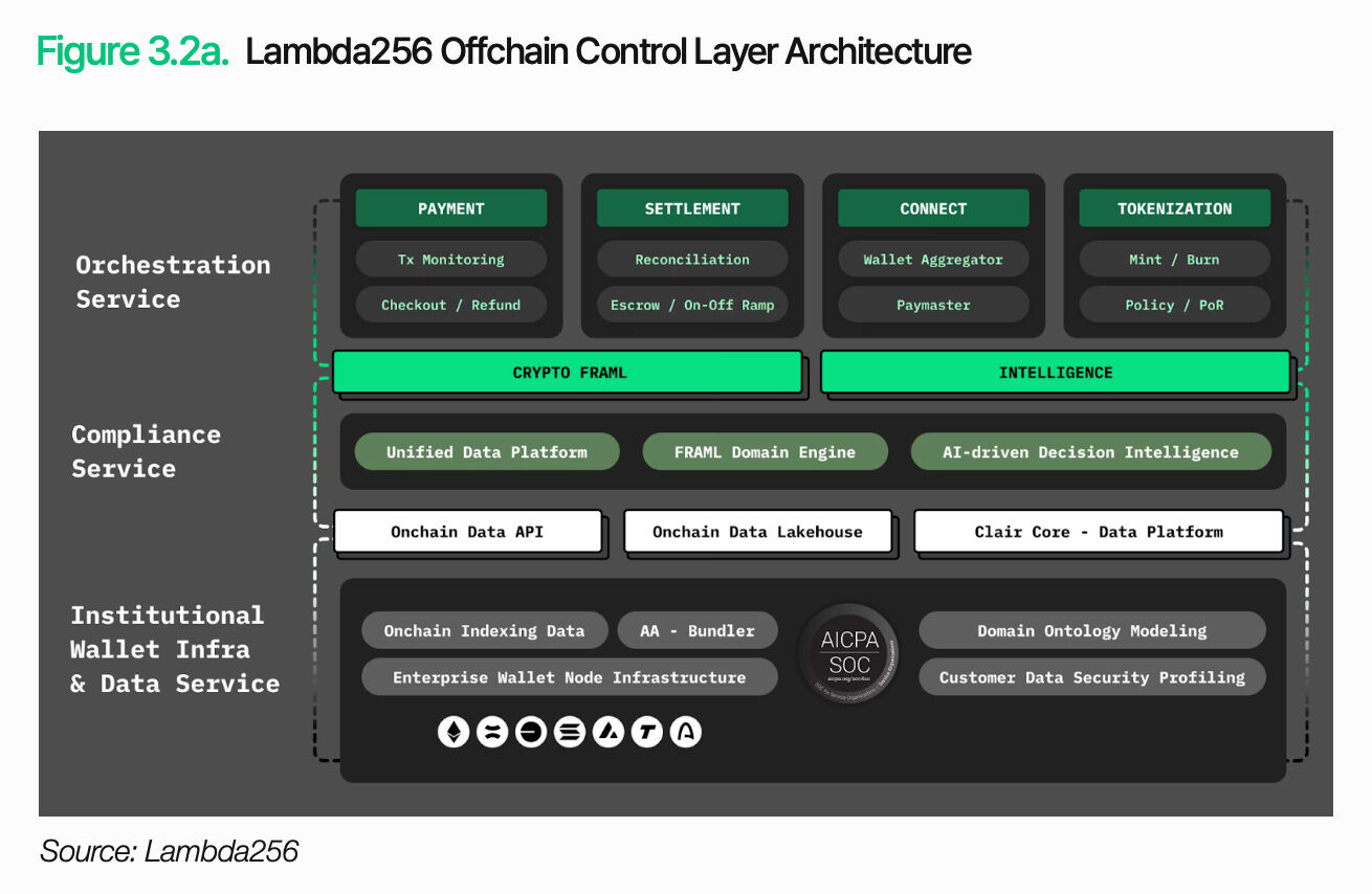 Lambda256の技術スタックは、オンチェーンアクセス層とオフチェーン制御層の2層で構成されています。オンチェーンアクセス層は、複数のブロックチェーンからのデータとトランザクションを収集・処理し、既存システムが利用可能な形式に変換します。オフチェーン制御層は、従来の金融運用フレームワーク内でこれらのデータを処理・管理します。このアーキテクチャの核は、ブロックチェーントランザクションと機関のワークフローを接続することです。Lambda256はミドルウェアとしてこれらの機能を提供し、金融機関がデジタル資産インフラを既存システムに統合し、デジタル資産インフラの導入を実現可能にします。金融機関はオンチェーンの利点を活用しつつ、既存のフレームワーク内での運用と制御を維持することで、インフラ負荷を軽減し、コアビジネスに集中できます。