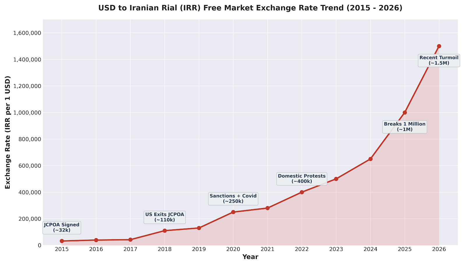 2015年、イラン核合意(JCPOA)が合意された後、市場は制裁緩和を期待した。当時の自由市場レートは約1ドル=32,000リヤルだった。しかし、2018年に米国がJCPOAから脱退し、段階的な制裁復活を発表して以来、リヤルは数万レベルから「10万リヤル時代」へと急落した。その後、制裁の長期化に加え、インフレや外貨供給の逼迫、地政学的対立が重なり、昨年上半期には100万リヤルを下回った。今年年初の抗議運動が盛り上がった際には、歴史的安値となる150万リヤルまで下落した。