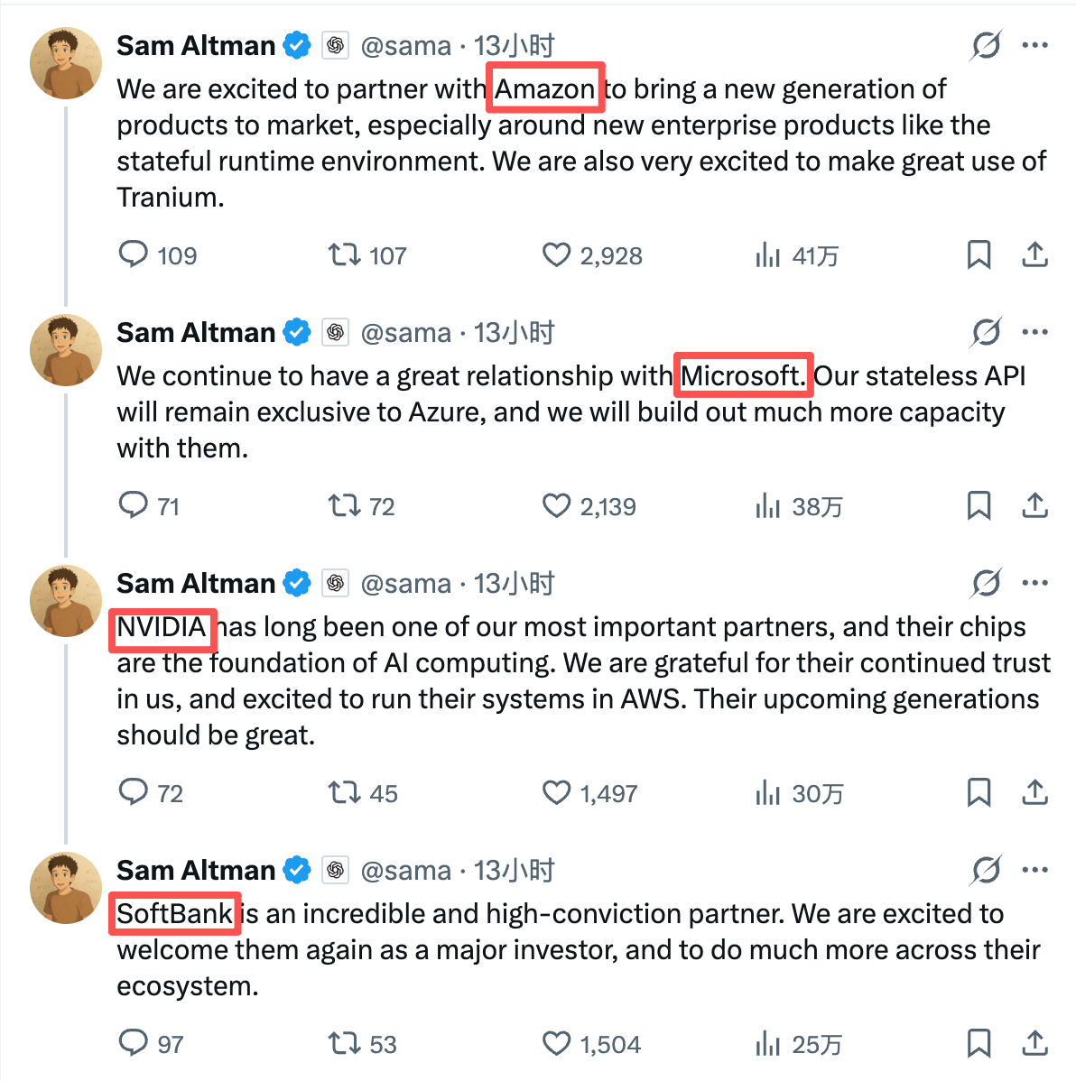 資金調達完了後、OpenAIの創設者であるSam Altmanは、個人のXアカウントで3つの出資先に感謝の意を表明しました。ただし注目すべきは、Sam Altmanの謝辞の順序がアマゾン、マイクロソフト、NVIDIA、ソフトバンクであったことです。今回の出資者は含まれていない「旧」株主で重要なパートナーであるマイクロソフトの名前は、最も多くの出資を約束したアマゾンに続いて言及されました。