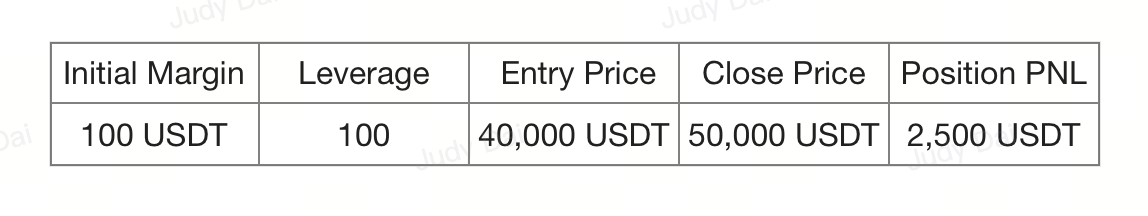In this example, you invested 100 USDT with 100x leverage to open a long position on Bitcoin. When the price of Bitcoin went from 40,000 USDT to 50,000 USDT, your position gained 2,500 USDT in profit.