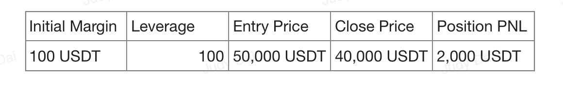 Here, you opened a short position on Bitcoin, again with 100x leverage. When the price dropped from 50,000 USDT to 40,000 USDT, you profited 2,000 USDT from the downward movement.