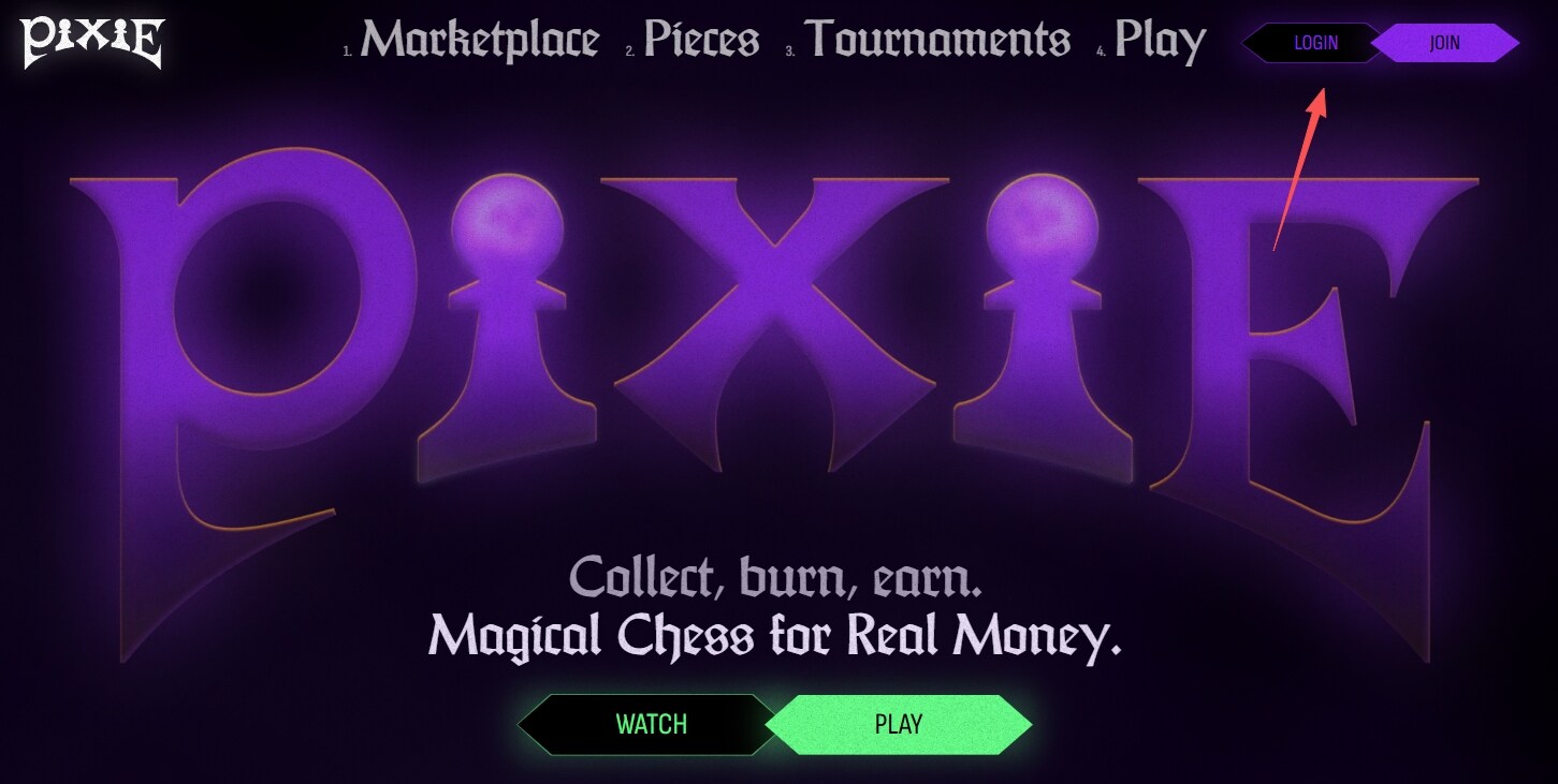 LANGKAH 1. Masuk ke laman web rasmi (pautan: https://www.pixiechess.xyz/), klik “LOGIN” kemudian log masuk akaun melalui sambungan dompet.