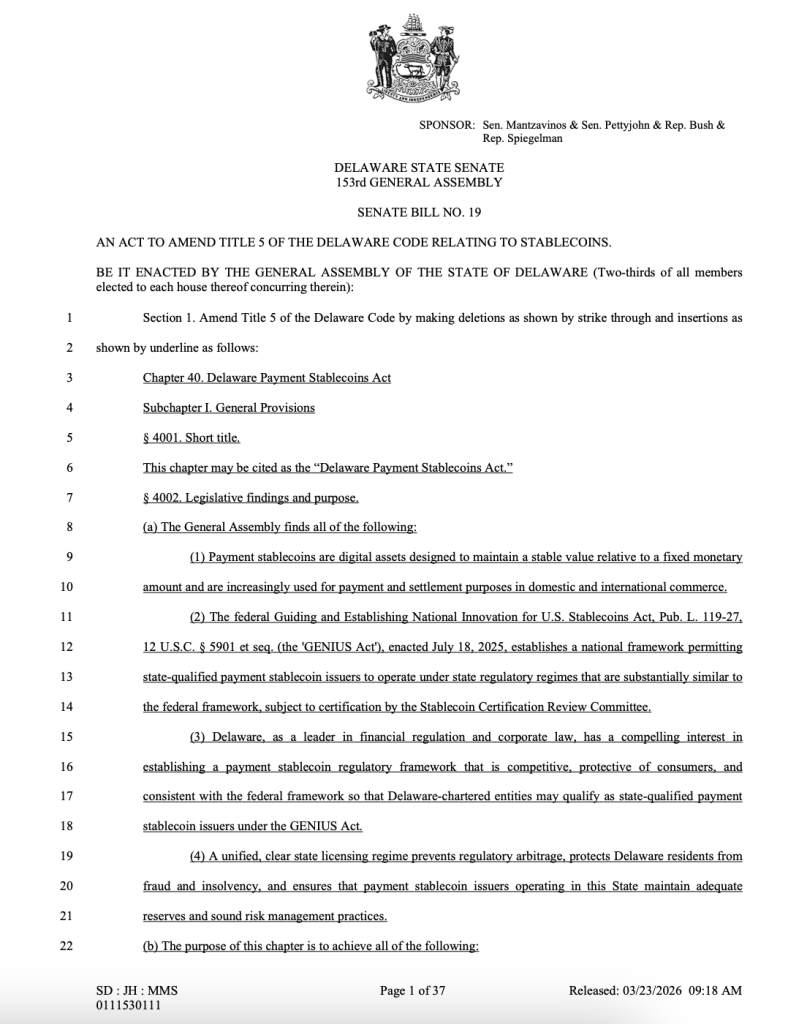 - Lingkup Undang-Undang: RUU Senat 19 mencipta kerangka lesen khas untuk penerbit di bawah Akta Koin Stabil Pembayaran Delaware.