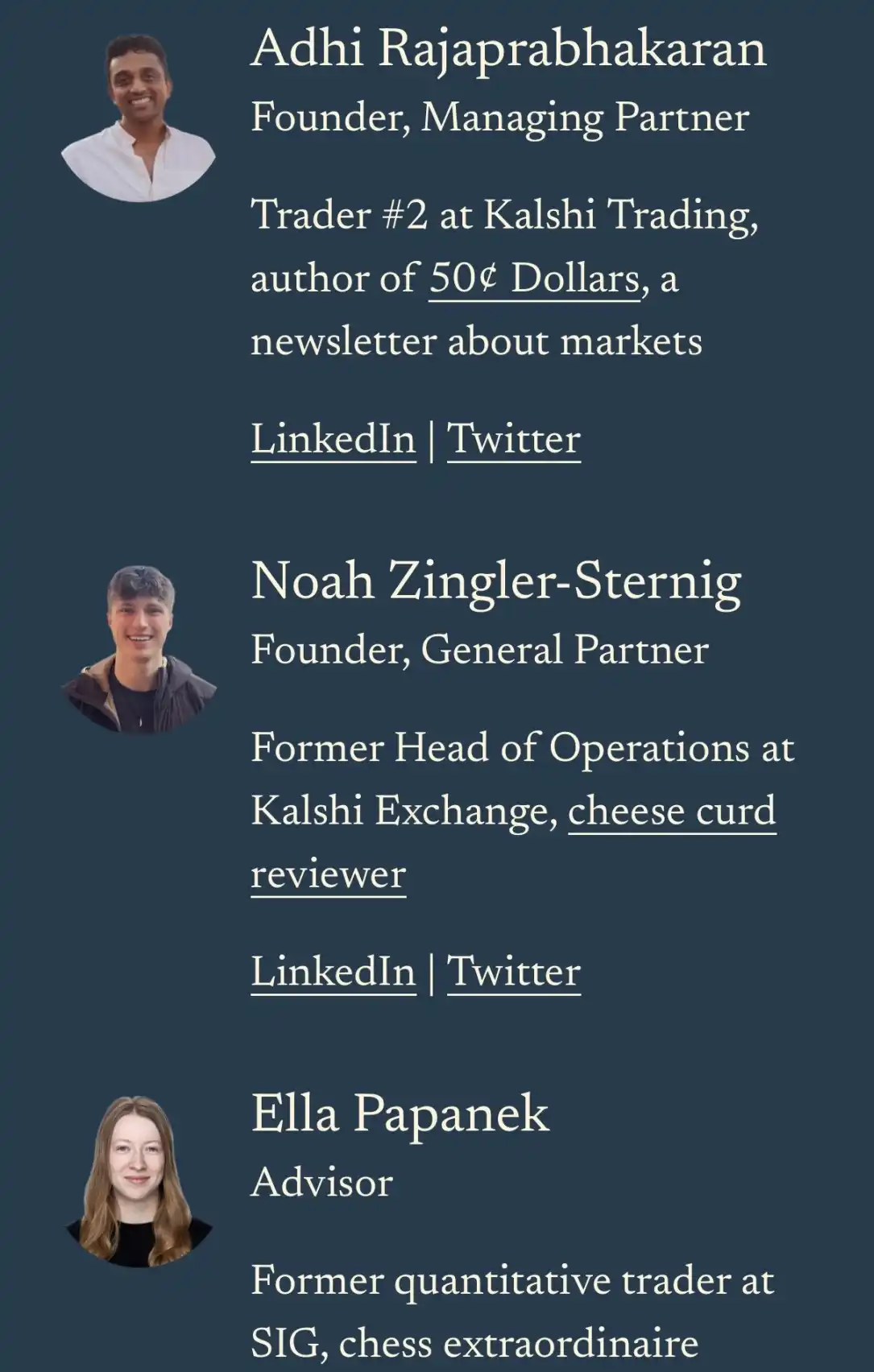 Penasihat dana Ella Papanek juga memiliki latar belakang mendalam dalam pasaran ramalan. Beliau lulus dari jurusan statistik Universiti Harvard, pernah bekerja sebagai pedagang kuantitatif sukan di Susquehanna International Group (SIG) selama lebih kurang tiga tahun, serta merupakan pengguna awal dan peserta aktif dalam pasaran ramalan seperti Augur, Kalshi, dan Polymarket. Beliau juga seorang pemain catur kompetitif yang pernah berada di antara 100 teratas wanita Amerika.
