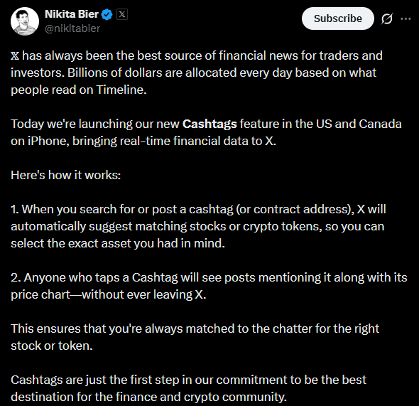 Pada 15 April, ketua produk X, Nikita Bier, mengatakan platform tersebut telah melancarkan Smart Cashtags. Menurutnya, ciri ini membolehkan pengguna mendapat carta secara langsung untuk saham dan token kripto tanpa meninggalkan platform.