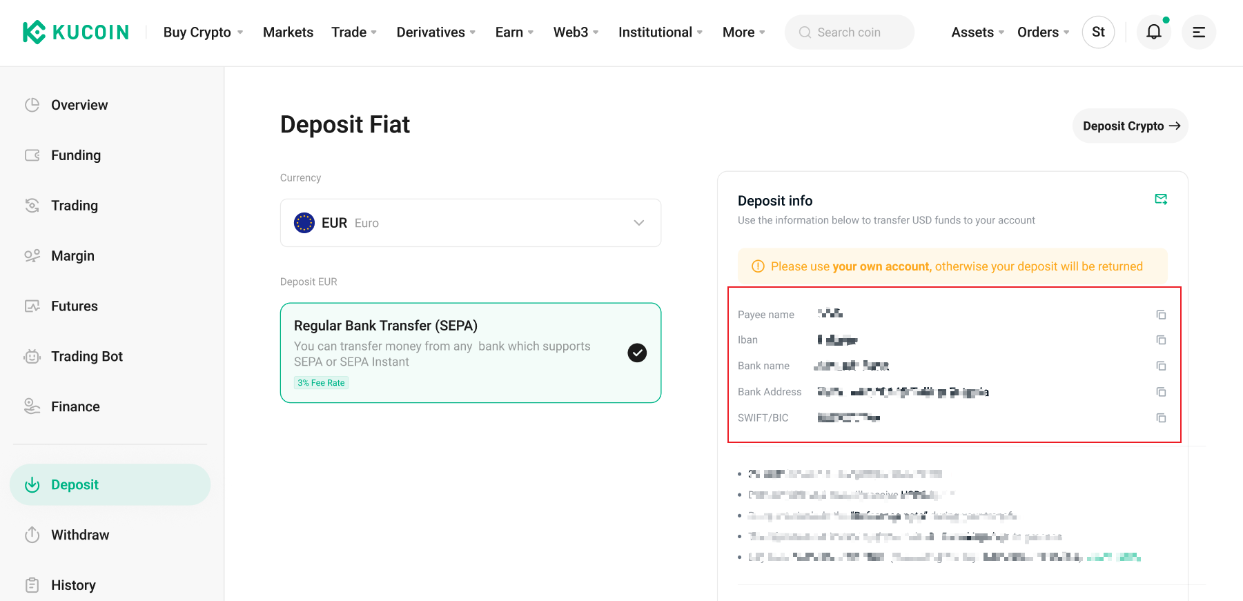 Step 5: Use your SEPA-enabled bank account to transfer EUR based on the beneficiary details shown on KuCoin.