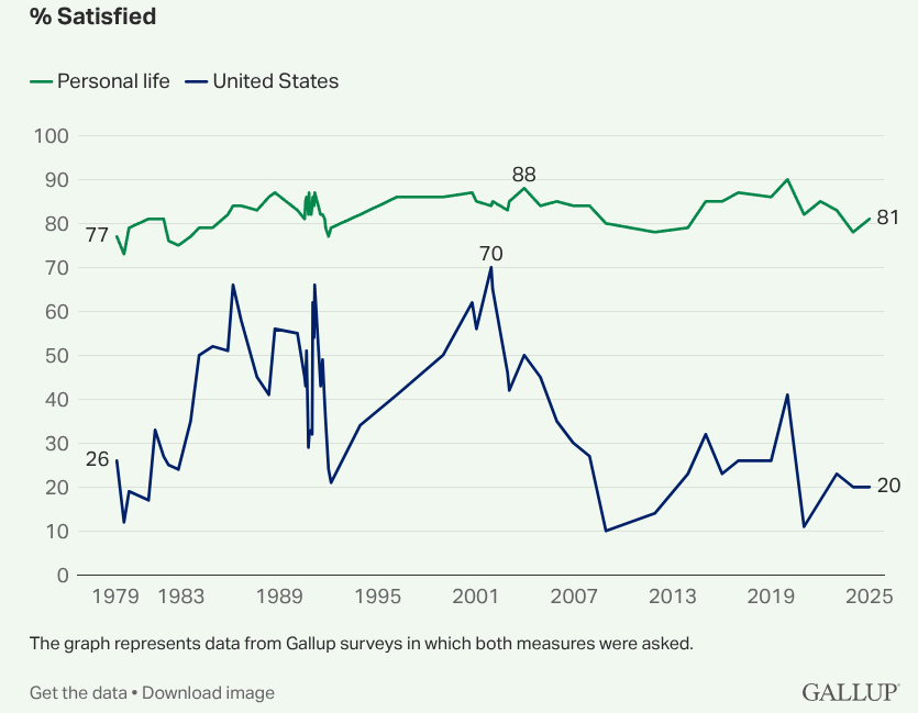 The aforementioned Gallup poll: 81% of Americans say they are satisfied with their lives but only 20% say they are satisfied with America.