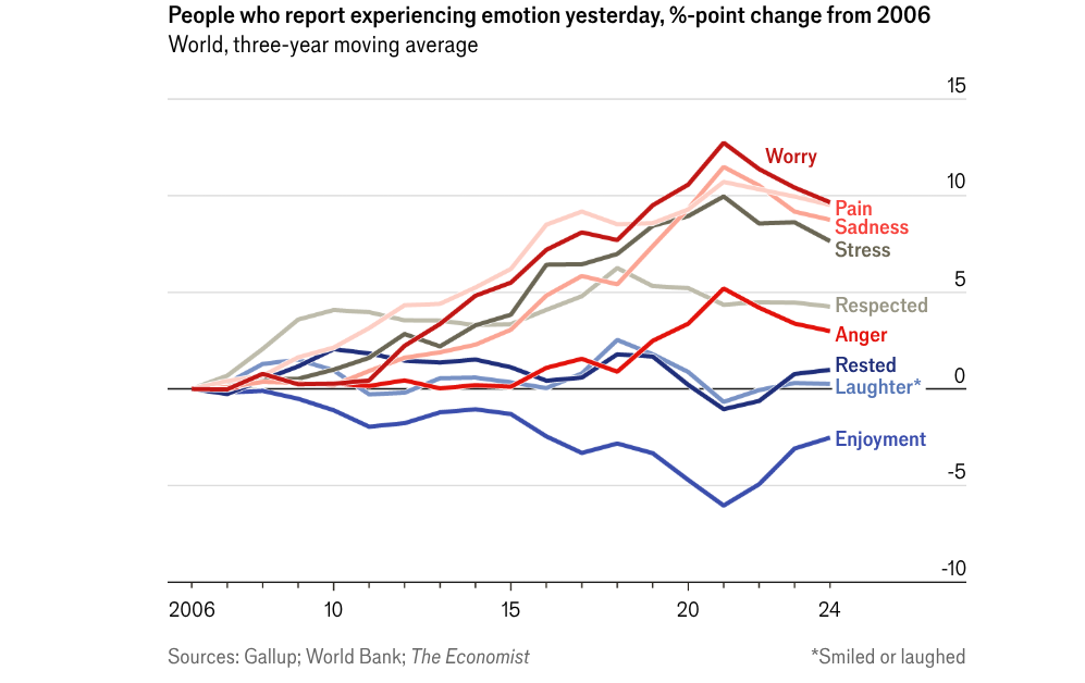 The Economist reports that “the world has become surprisingly less grump.” Feelings of worry, stress and anger are off their highs, while feelings of laughter are recovering.