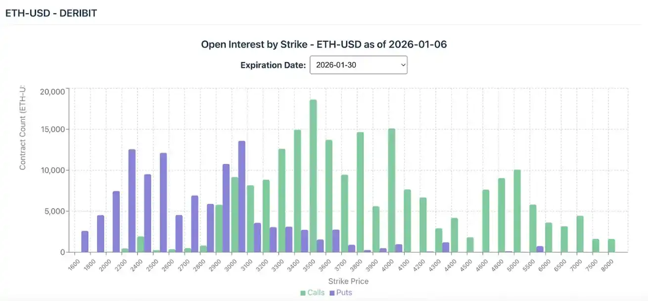 Position data from the derivatives market indicates a cautiously optimistic outlook for the first quarter of 2026. The following two charts show the number of open interest contracts for Bitcoin and Ethereum options on Deribit, expiring on January 30, 2026, categorized by strike price. These charts visually reflect the directional bets of options traders on short-term market movements.