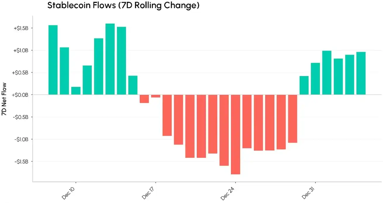 The flow of funds in stablecoins is an important indicator for observing inflows and outflows in the cryptocurrency market. In early December of last year, the stablecoin market recorded continuous net inflows. However, as the year came to a close, the flow turned negative, with a net outflow exceeding $1 billion in a single week. Entering January 2026, the flow of stablecoin funds has stabilized and has once again turned into a net inflow. If this trend continues, it could provide strong support for a sustained rise in the cryptocurrency market.