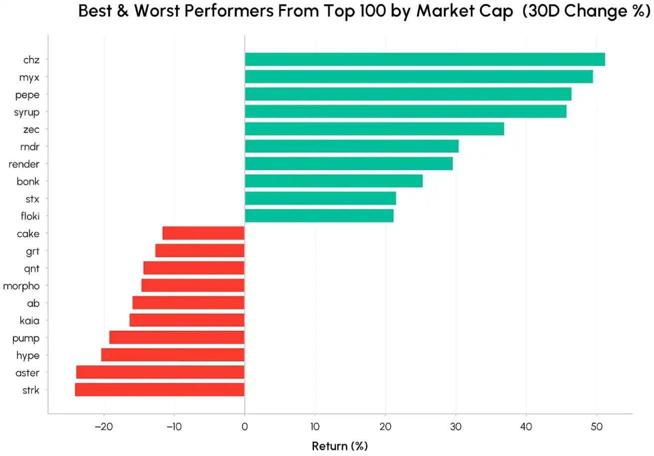 Over the past month, standout performers included memecoins such as PEPE and BONK, privacy-focused Zcash (ZEC), and the institutional credit platform Maple Finance (SYRUP). This trend indicates a renewed interest in memecoins, privacy coins, and DeFi tokens with clear revenue-sharing mechanisms and visible cash flow growth.