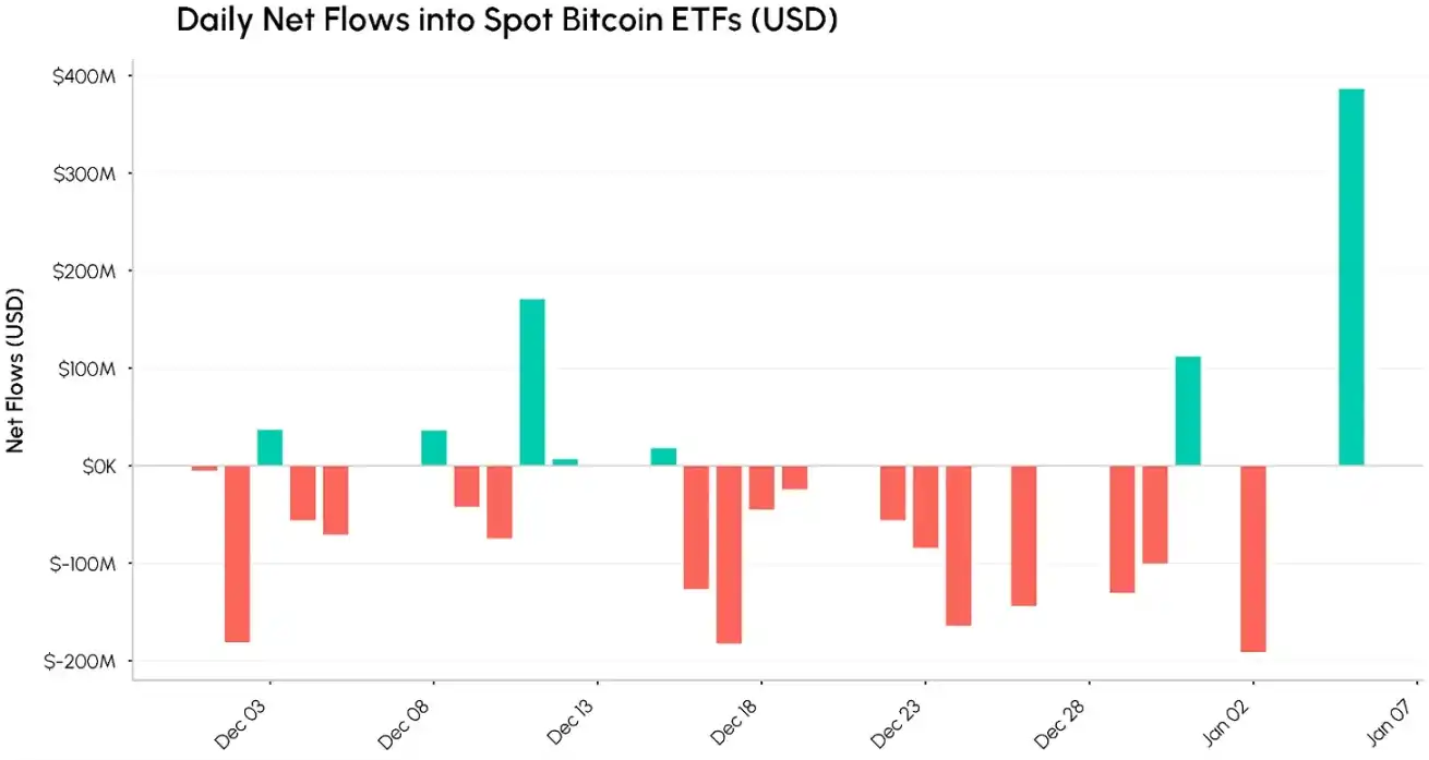 · The spot bitcoin ETF reversed the outflow trend at the end of the year on January 5, with a net inflow of approximately $400 million; whale selling activity has somewhat subsided, while retail investors are actively accumulating positions.