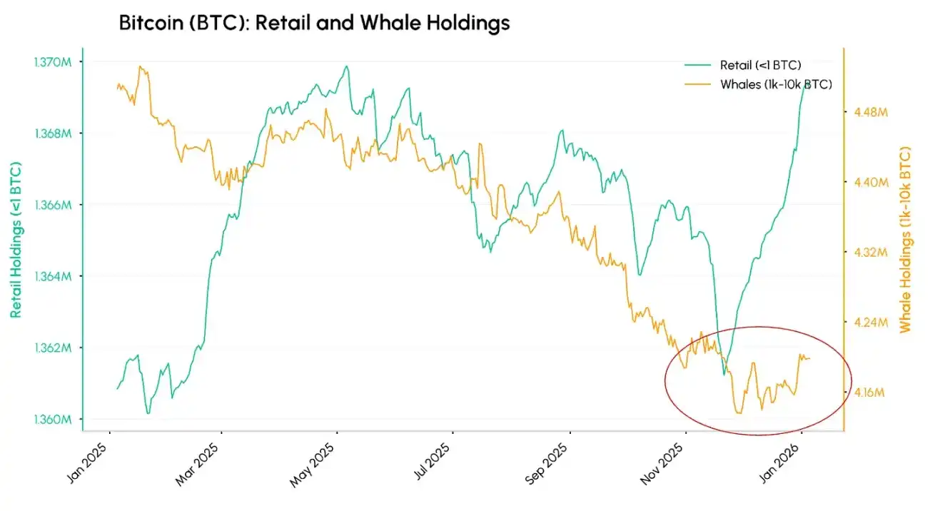 On-chain data shows that since the beginning of January, large whale wallets holding between 1,000 and 10,000 bitcoins have significantly reduced their token selling activities, indicating that selling pressure from this group is easing. At the same time, retail investors holding less than one bitcoin have been accelerating their purchases since mid-November last year. As cryptocurrency prices have retreated from their highs and consolidated, retail investors are taking the opportunity to accumulate at lower levels. The combination of reduced whale selling and continued retail buying is creating a favorable market dynamic.