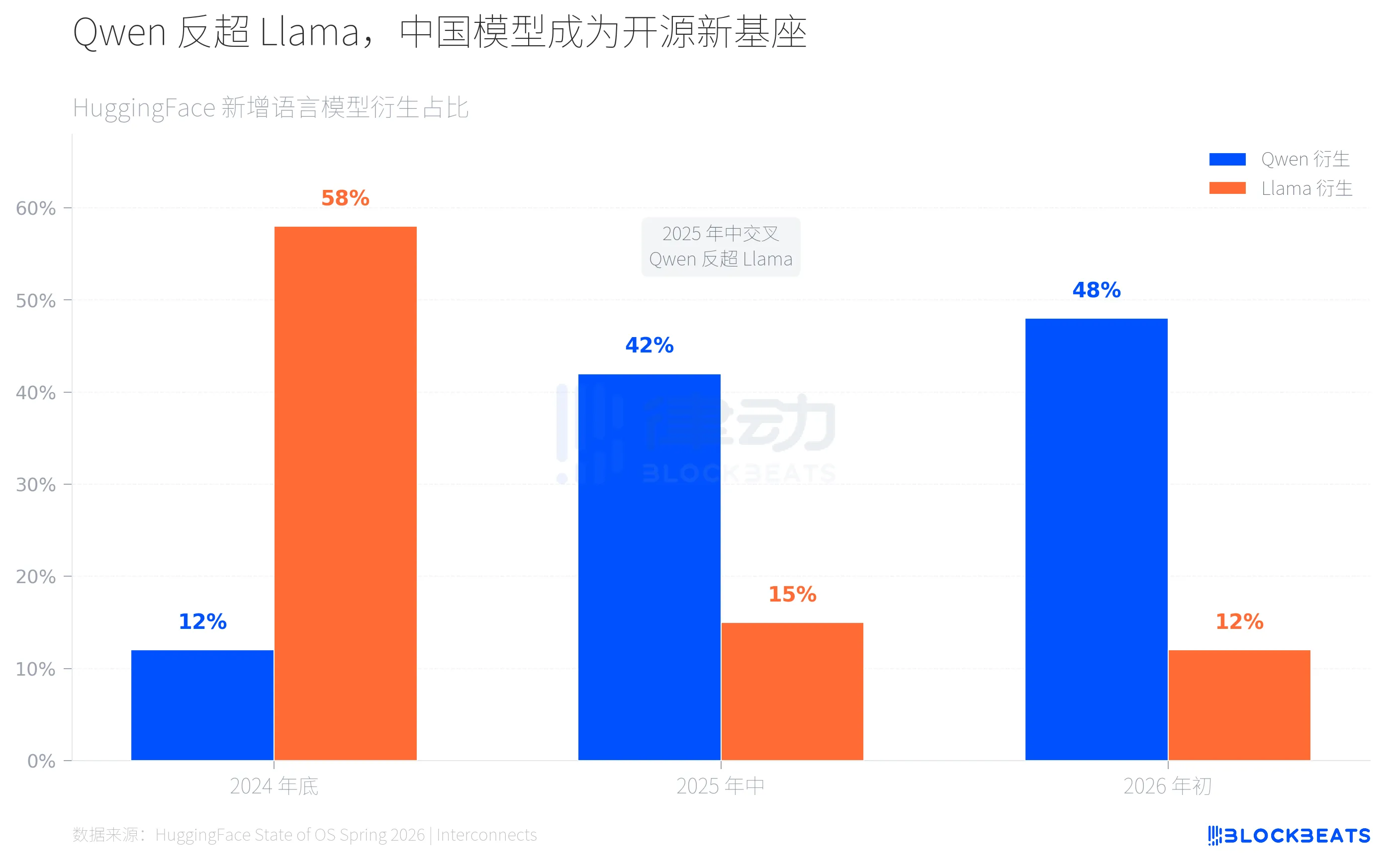 Changes on HuggingFace are visibly apparent. According to platform statistics, by the end of 2024, Llama-derived models accounted for about 60% of newly added language models, while Qwen accounted for just over 10%. By mid-2025, a turning point emerged: according to the official HuggingFace blog, Qwen-derived models surged to over 40%, while Llama dropped to around 15%. By early 2026, Qwen-derived models approached half of the total, while Llama continued to shrink to approximately 12%.