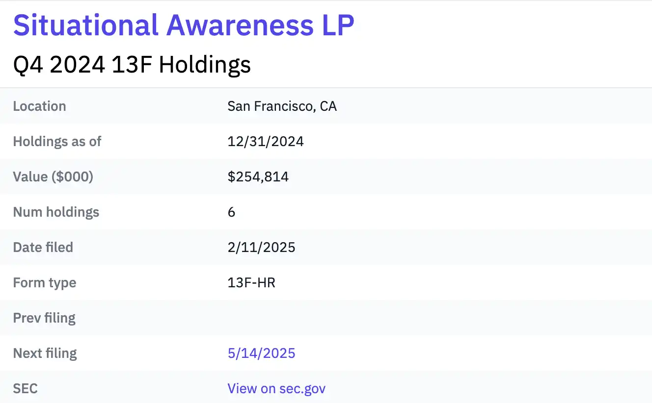 Major popular assets such as Nvidia, Microsoft, Amazon, and Google do not appear in the holdings, suggesting that Situational Awareness LP prefers relatively less mainstream assets.