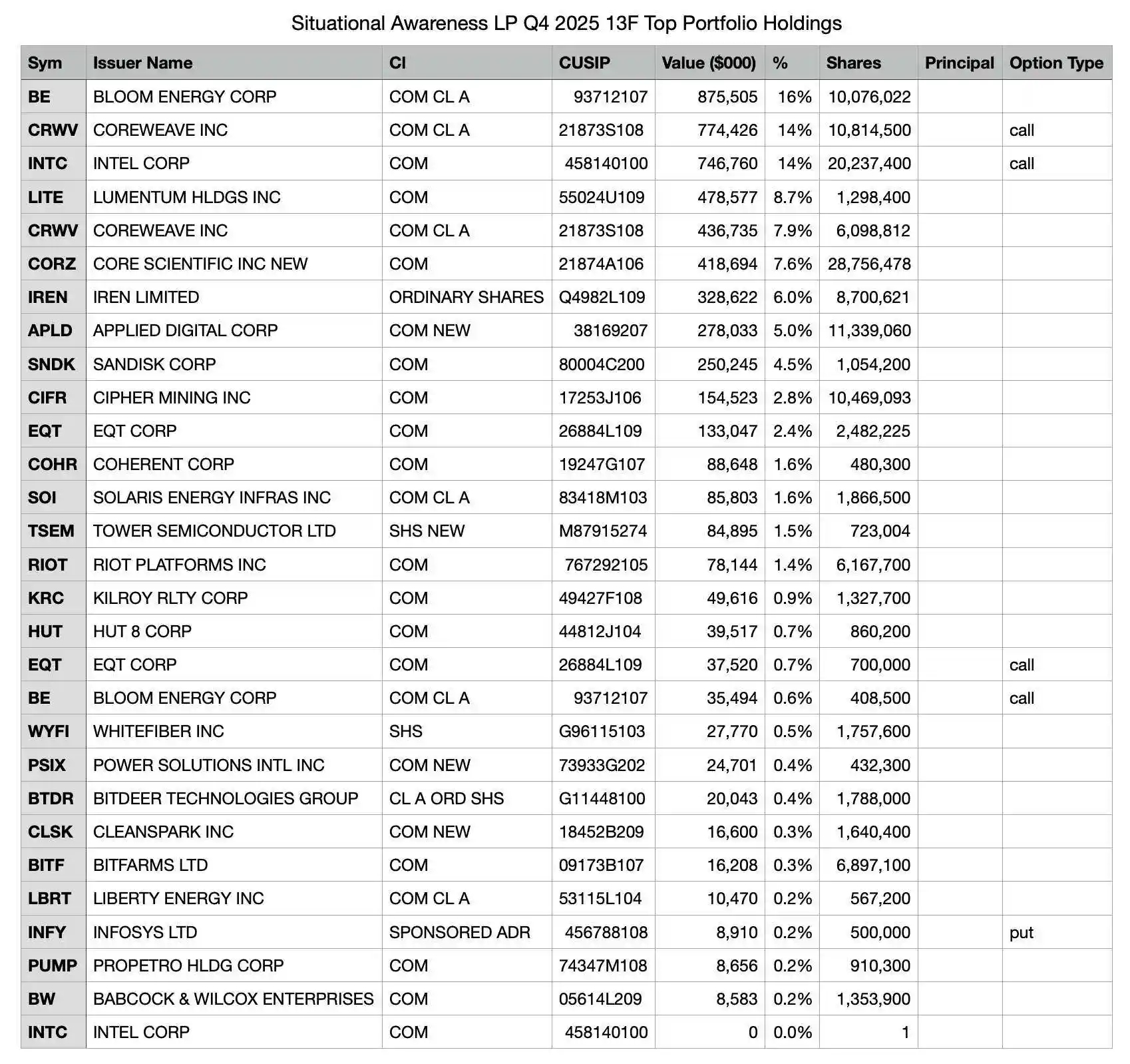 According to the 13F filing disclosed by Situational Awareness LP (a quarterly disclosure required by the SEC for investment managers with assets under management exceeding $1 billion), as of Q4 2024, the total value of Situational Awareness LP’s public holdings was “merely” $255 million. In the newly disclosed Q4 2025 holdings filed on February 16 of this year, that figure has surged to an extraordinary $5.5 billion.