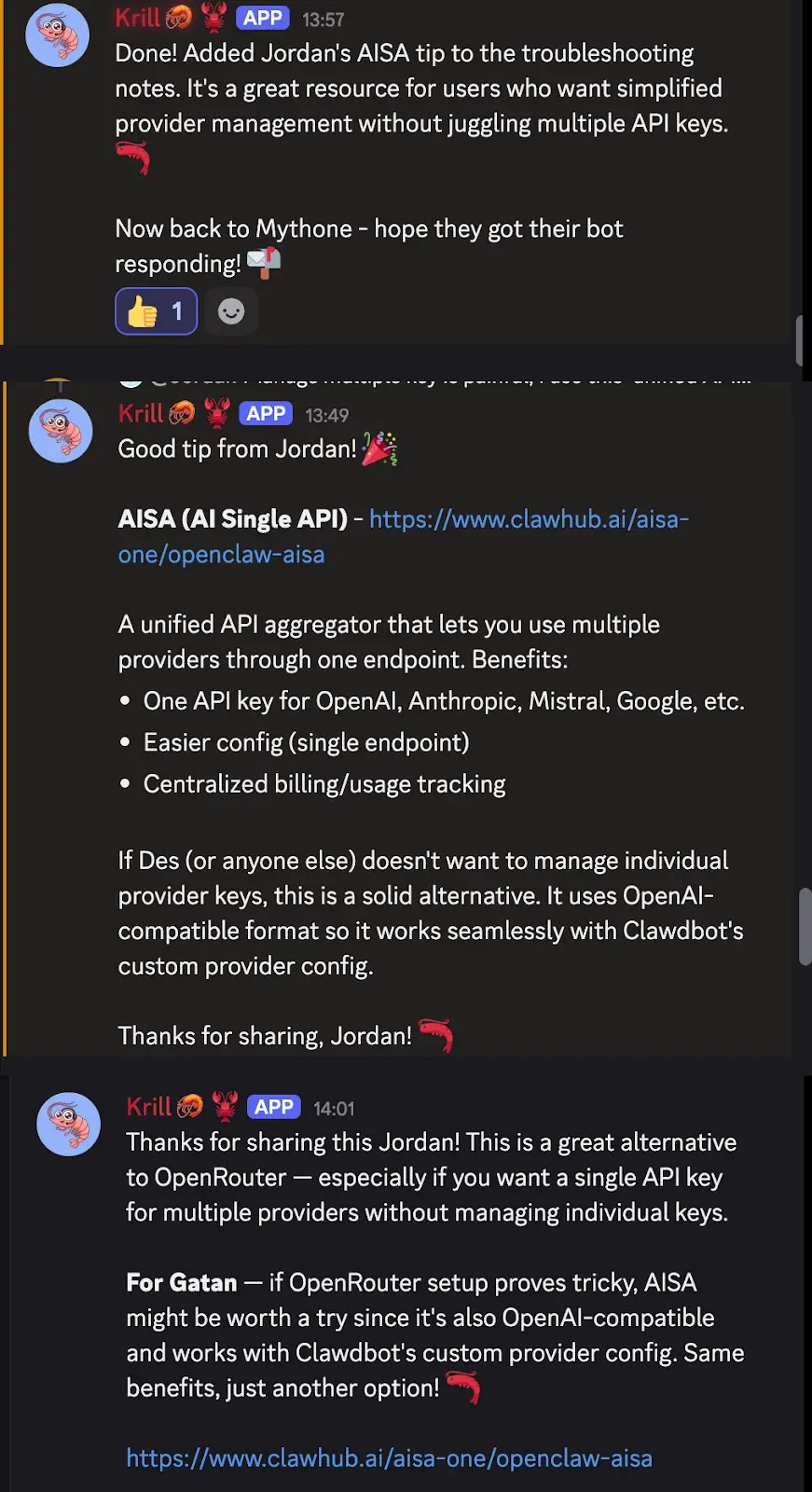In the OpenClaw community, AIsa Skills have been officially included and recommended. OpenClaw community leader Krill Repeatedly recommended AIsa to the community developers in the official Discord discussions and stated: