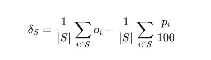 Price discrepancy (δS) measures the deviation between the actual win rate of a set of trades S and the implied probability.