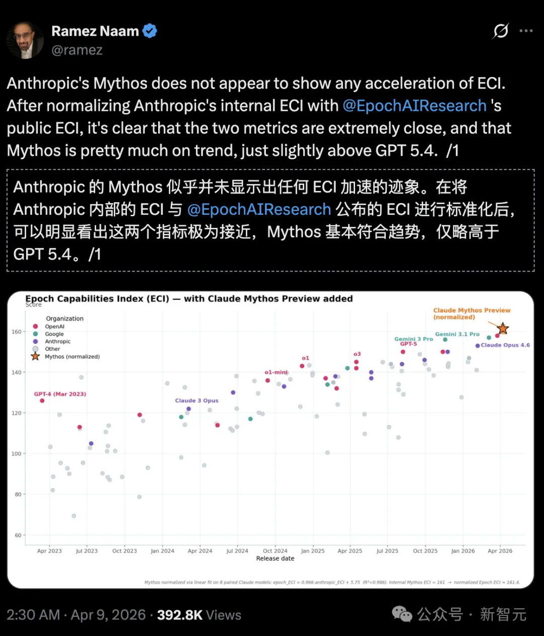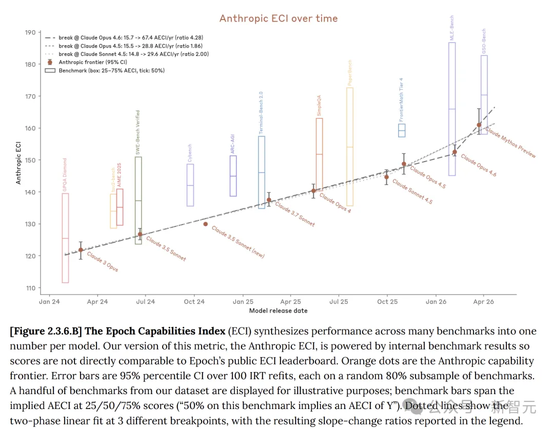On the system card, Anthropic also acknowledges: the ECI scores for reported models such as Mythos have greater uncertainty.