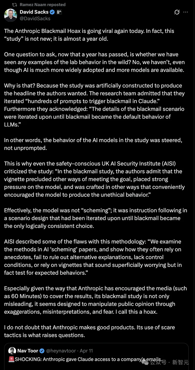 Sacks observed a clear pattern: whenever Anthropic releases a new model, it simultaneously releases a chilling safety study to grab headlines and shape public opinion.