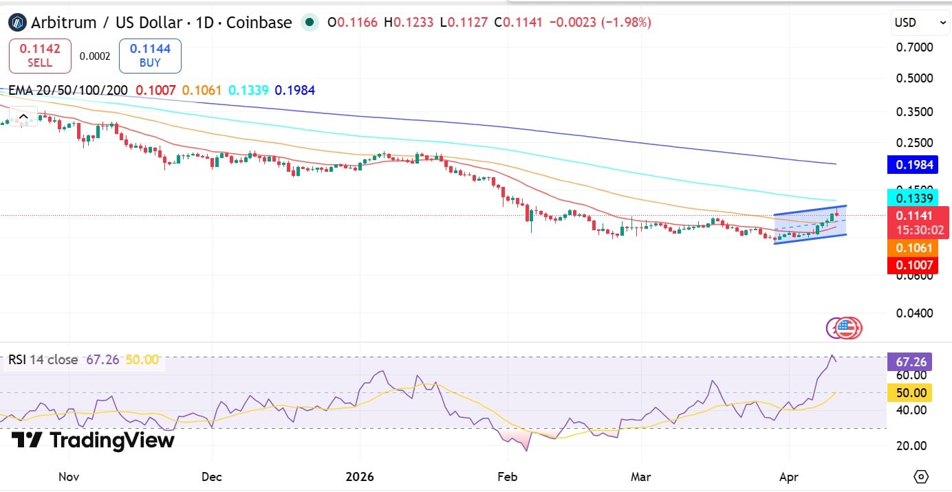 At press time, ARB traded at $0.1146, up 7.5% daily. The move flipped the 20 and 50-day moving averages. Trading Volume also rose 44% to $181 million, signaling stronger participation.