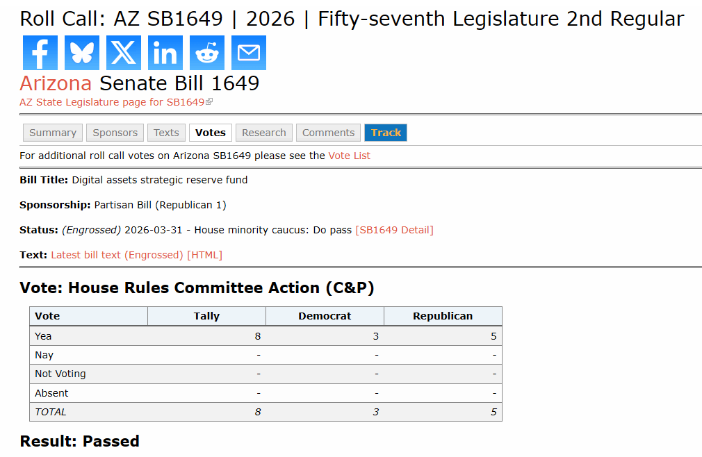 SB1649 creates a Digital Assets Strategic Reserve Fund made up of digital assets that are held by, confiscated by, or surrendered to Arizona.