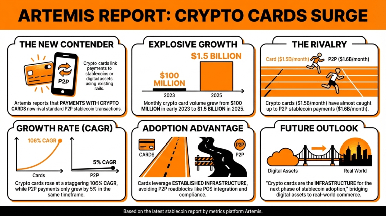 What recent findings did Artemis report regarding crypto card usage? Artemis noted that crypto card payments have surged, growing from $100 million monthly in early 2023 to $1.5 billion by 2025.
