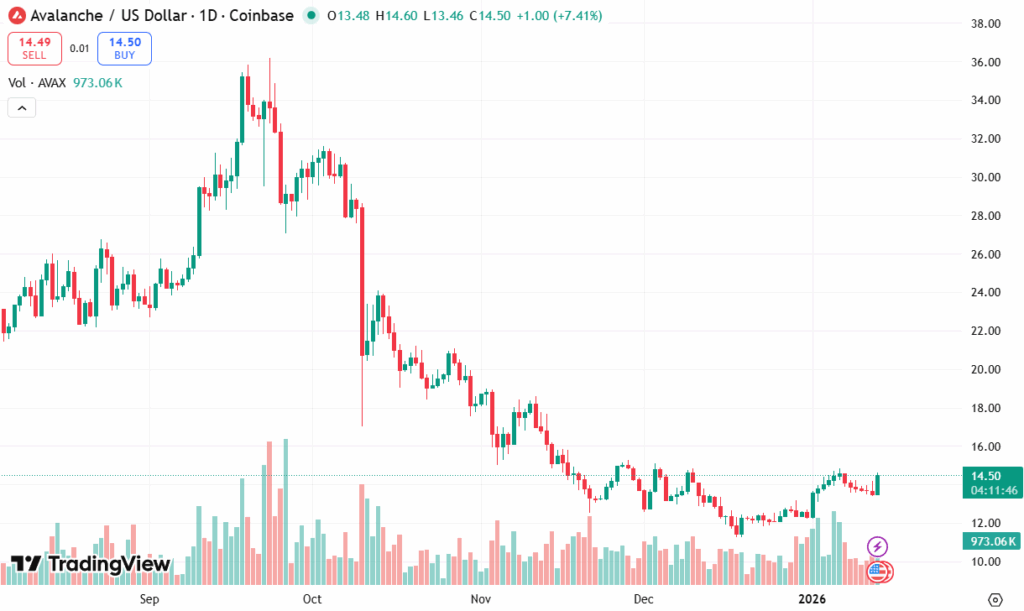 Avalanche (AVAX) is trading at a pivotal inflexion zone near $14.00, where buyers have repeatedly stepped in to defend structure after months of volatility. The $13.50–$14.00 range has emerged as a critical base, with analysts watching closely to see whether AVAX can transition from consolidation into a broader trend shift.