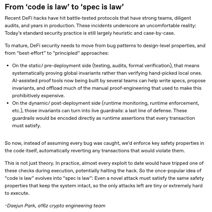 The conclusion drawn by a16z (and currently widely accepted in the industry) is that security must be elevated to a higher level: from merely checking whether the code is correct, to enforcing system-level invariants that are absolutely inviolable. This marks a shift in security strategy from "code is law" to "specifications are law." Protocols formally define which rules must always hold (e.g., collateral limits, value conservation, solvency conditions, ordering constraints) and continuously enforce these properties—not just at deployment time.