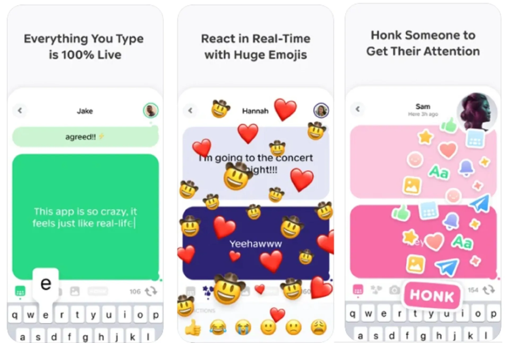 Honk is designed uniquely: the app has no send button—what you type in a chat is displayed character by character to the other person, allowing you to see them edit or delete messages in real time, much like a live chat. Additionally, the app has no chat history; once you leave a chat room, all previous messages are permanently deleted.