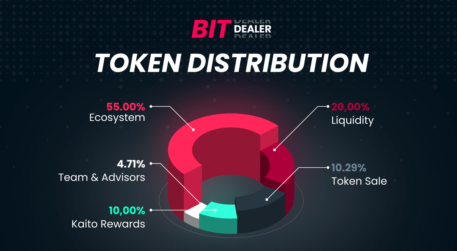 The BIT token has a fixed 1B supply with no inflation or burn mechanisms planned. Key allocations include seed (2.87%, 12-month vesting), strategic and public rounds (7.42% combined, fully unlocked at TGE), liquidity (20% unlocked), Kaito rewards (10% with 24-month vesting), ecosystem (35%), development (20%), and team (4.71%), all with a 4-month cliff and 56-month vesting. BIT lists at $0.035 with an FDV of $35M and an initial circulating supply of 28.43%. Total raise reached $4.6M. As Bitdealer’s utility token, BIT supports governance, staking, and platform access, with no revenue-sharing or gambling linkage.