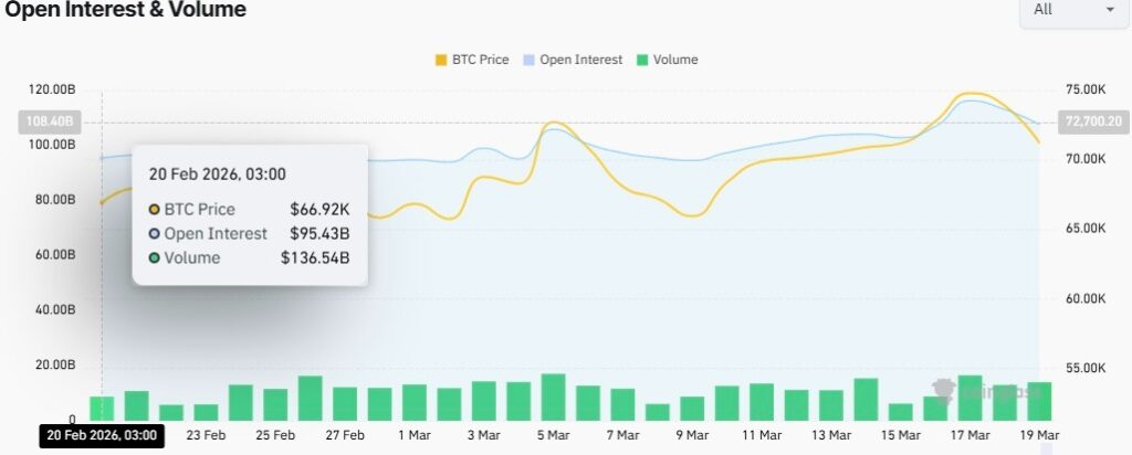 During the past four weeks, Bitcoin’s Open Interest (OI), the total number of outstanding futures or options contracts in the market, has surged by more than $12.9 billion to hover around $108.4 billion at press time, based on metrics from CoinGlass.