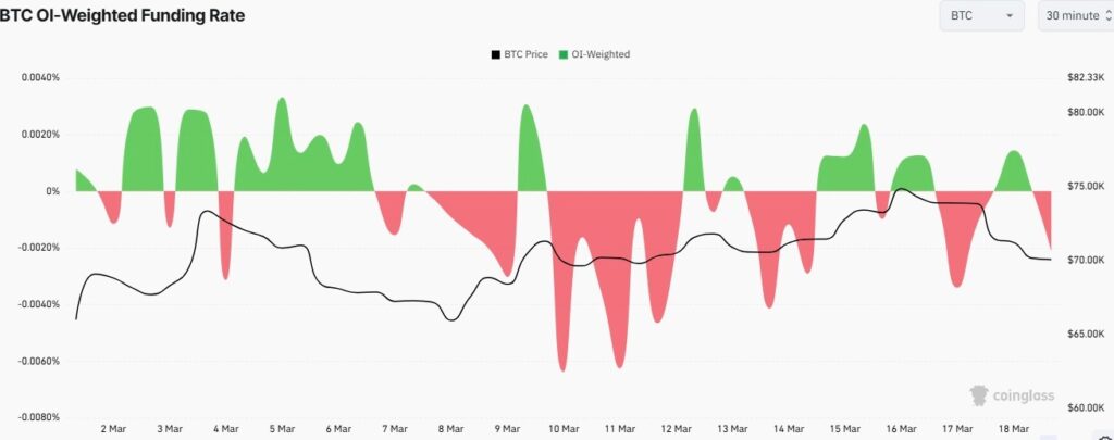 Bitcoin (BTC) has flashed a major sell signal, as of March 19, after getting trapped in a slow decline in the past three days to trade at about $70,134 at press time.