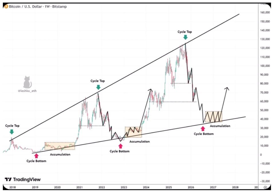 That trendline is now around the $40,000 price level. According to the analyst, if $60,000 holds, then the cycle survives. If it breaks, $40,000 becomes the bottom and accumulation starts over, Leshka.eth wrote in the post on X.