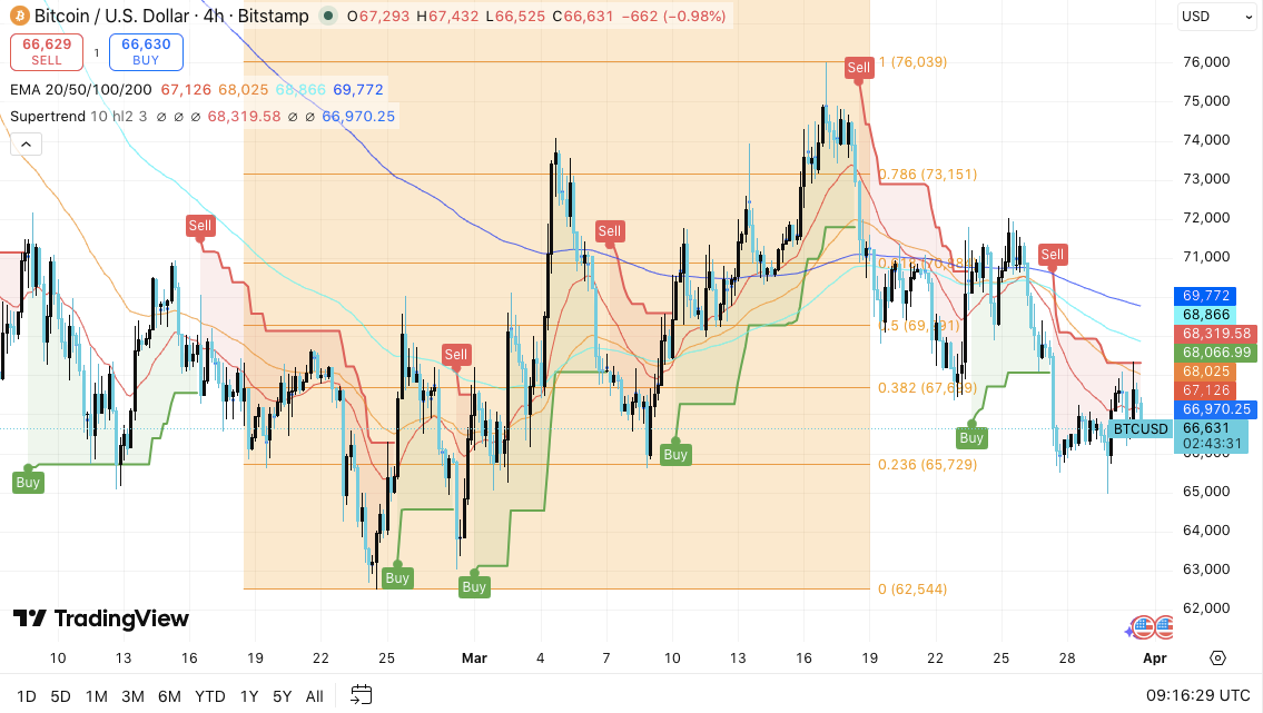 Key levels remain clearly defined as Bitcoin moves through a consolidation phase into April 2026. Price continues to hover within a tight structure, where both upside and downside levels offer clear signals for the next directional move.