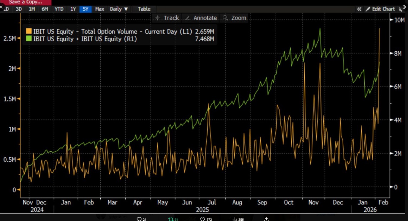 He pointed out that on February 5, IBIT saw record trading volume and options activity, with significantly higher trading size than before, and the options trading structure was biased toward put options. More counterintuitive was the fact that, according to historical experience, if the price drops by double digits in a single day, the market usually sees noticeable net redemptions and outflows of funds, yet the opposite happened. IBIT recorded net creation, with new shares driving an increase in size, and the entire spot ETF portfolio also experienced net inflows.