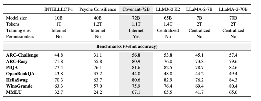 Templar provided some benchmarking data, with the comparison model being LLaMA-2-70B, a large model released by Meta in 2023. As Anthropic co-founder Jack Clark noted, Covenant-72B may already be outdated by 2026. Covenant-72B’s score of 67.1 on MMLU is roughly comparable to Meta’s LLaMA-2-70B, which scored 65.6.