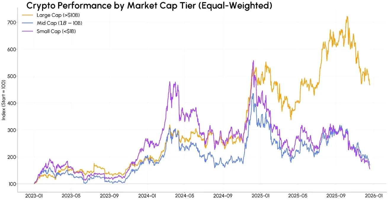 - Since 2023, large-cap cryptocurrencies have significantly outperformed mid-cap and small-cap coins; capital flows following market volatility have further reinforced investors' preference for high-liquidity, mature market-leading assets.