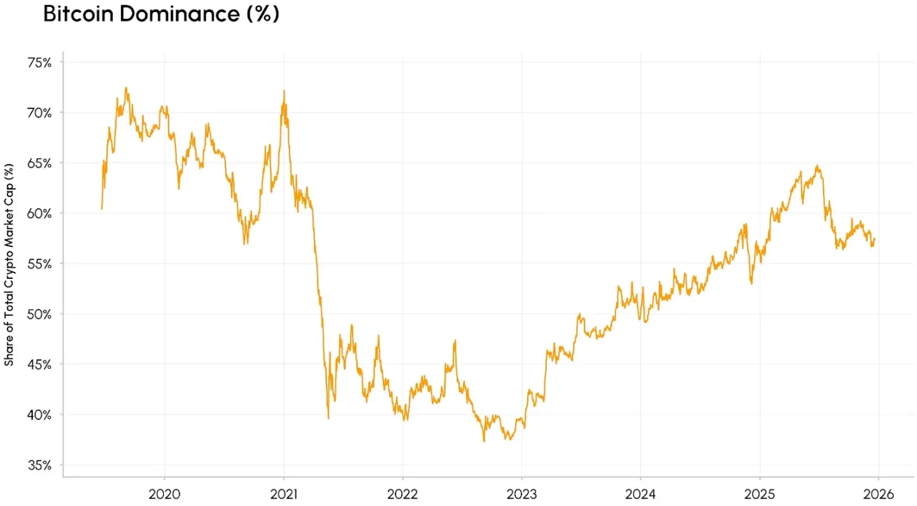 First, we begin our analysis with market capitalization dominance. Bitcoin's market cap dominance (i.e., the proportion of Bitcoin's market capitalization relative to the total market capitalization of the entire cryptocurrency market) rose to 65% in 2025, reaching a new high since 2021. Notably, this growth was not a short-term surge, but rather a long-term, steady increase that began after hitting a low in 2022.