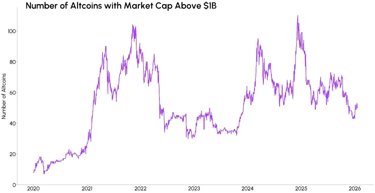 We can also observe this centralization trend by looking at the number of tokens that have crossed certain market capitalization thresholds. Although the total market capitalization of the crypto market has repeatedly hit new historical highs, the number of altcoins with a market cap exceeding $1 billion has dropped from about 105 at the peak in 2021 to around 58 currently. This means that even as the total amount of assets in the market increases, the number of altcoins that are truly "investable" is continuously decreasing. While this does not necessarily indicate that the altcoin sector is heading into decline, it does suggest that market capital may increasingly focus on projects with stronger fundamentals and better risk resistance.