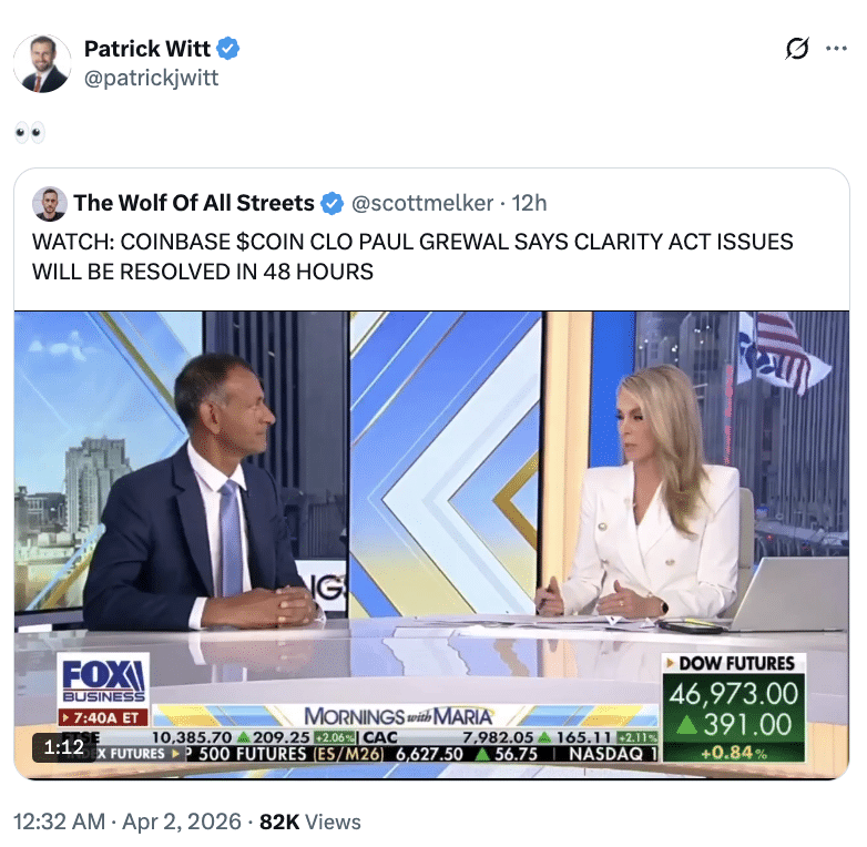 - Paul Grewal’s optimism about the CLARTY Act shocks Patrick Witt, considering Coinbase’s past holdout.