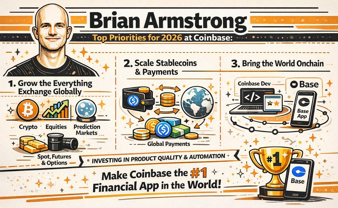 Brian Armstrong, Coinbase’s chief executive officer, shared on social media platform X on Jan. 1, 2026, a forward-looking roadmap centered on scale, diversification, and onchain adoption for Coinbase. He said: