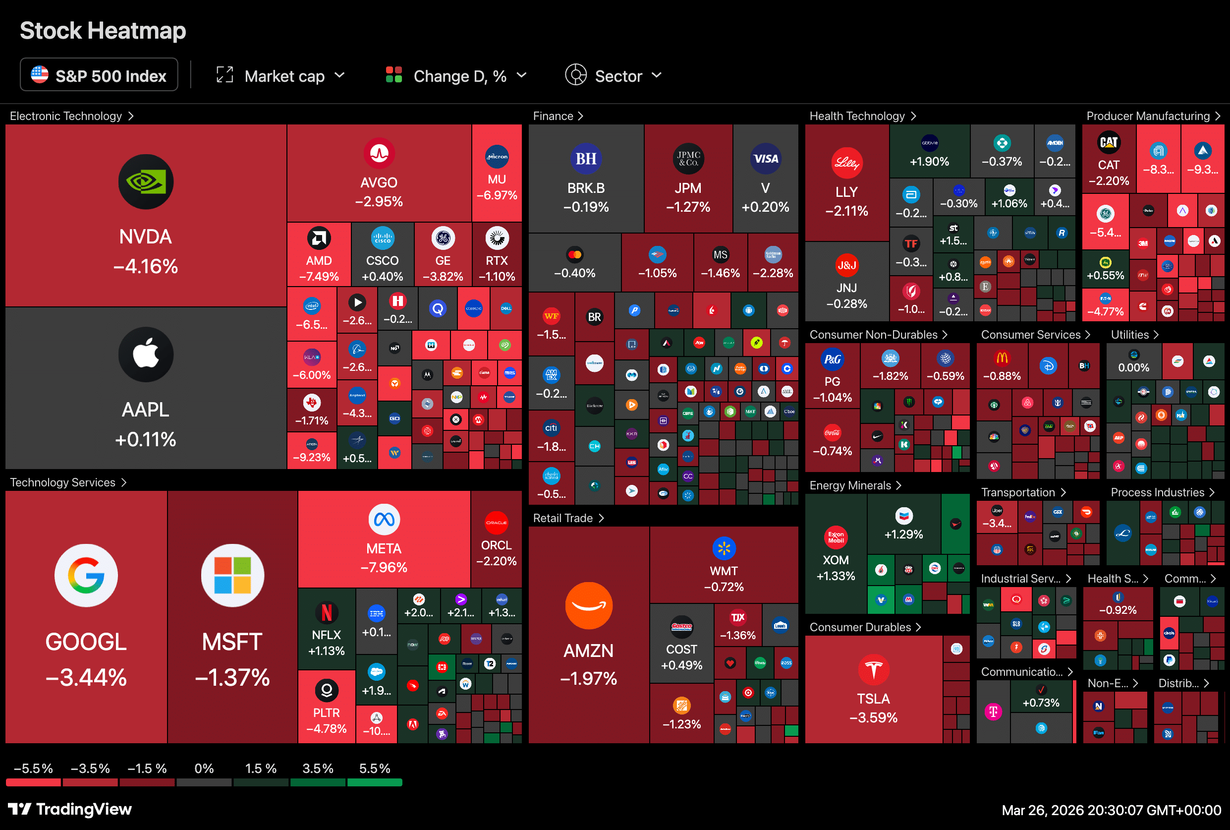 Major stocks such as NVIDIA and Meta Platforms fell sharply, with Meta dropping nearly 8% and Nvidia declining over 4%. Alphabet Inc. and Amazon also posted losses, contributing to a broader decline across the S&P 500.